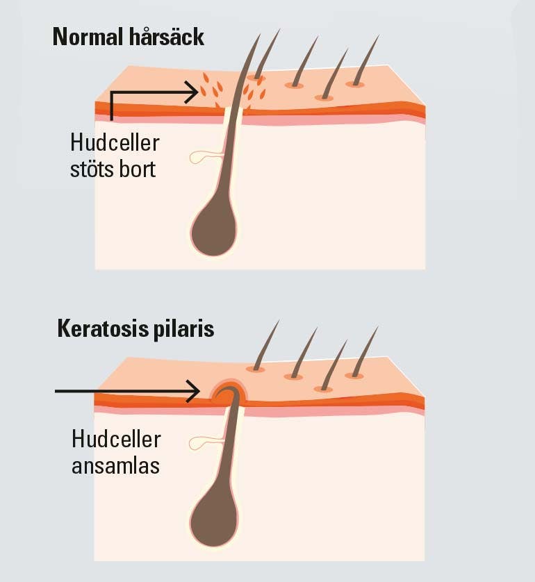 Keratosis pilaris uppstår när huden producerar för mycket keratin – även känt som döda hudceller. Överproduktionen inträffar när huden är torr. De döda hudcellerna ansamlas och bild- ar proppar i hårsäckarnas utgångar. Och det är så de små förhornade knottrorna uppstår.