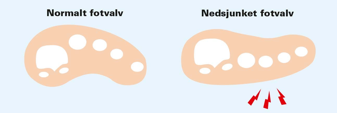 Nedsjunket fotvalv uppstår ofta med åldern och kan bero på överansträngning, en idrottsskada eller att man har använt dåliga skor. Normalt är fotvalvet spänstigt och format som ett lätt böjt valv. Stortån och lilltån är därför de som får bära mest tyngd. Och det klarar de, för de är robusta och skapade för uppgiften.