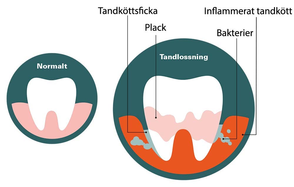 Kort förklarat är tandlossning, eller parodontit som det också heter, en vidare utveckling av tandköttsinflammation. Om du får en tandköttsinflammation som inte bromsas, kan den utvecklas till tandlossning. Det händer när infektionen sprider sig från den ytliga vävnaden runt tanden ner till den djupliggande vävnaden vid själva tandroten.