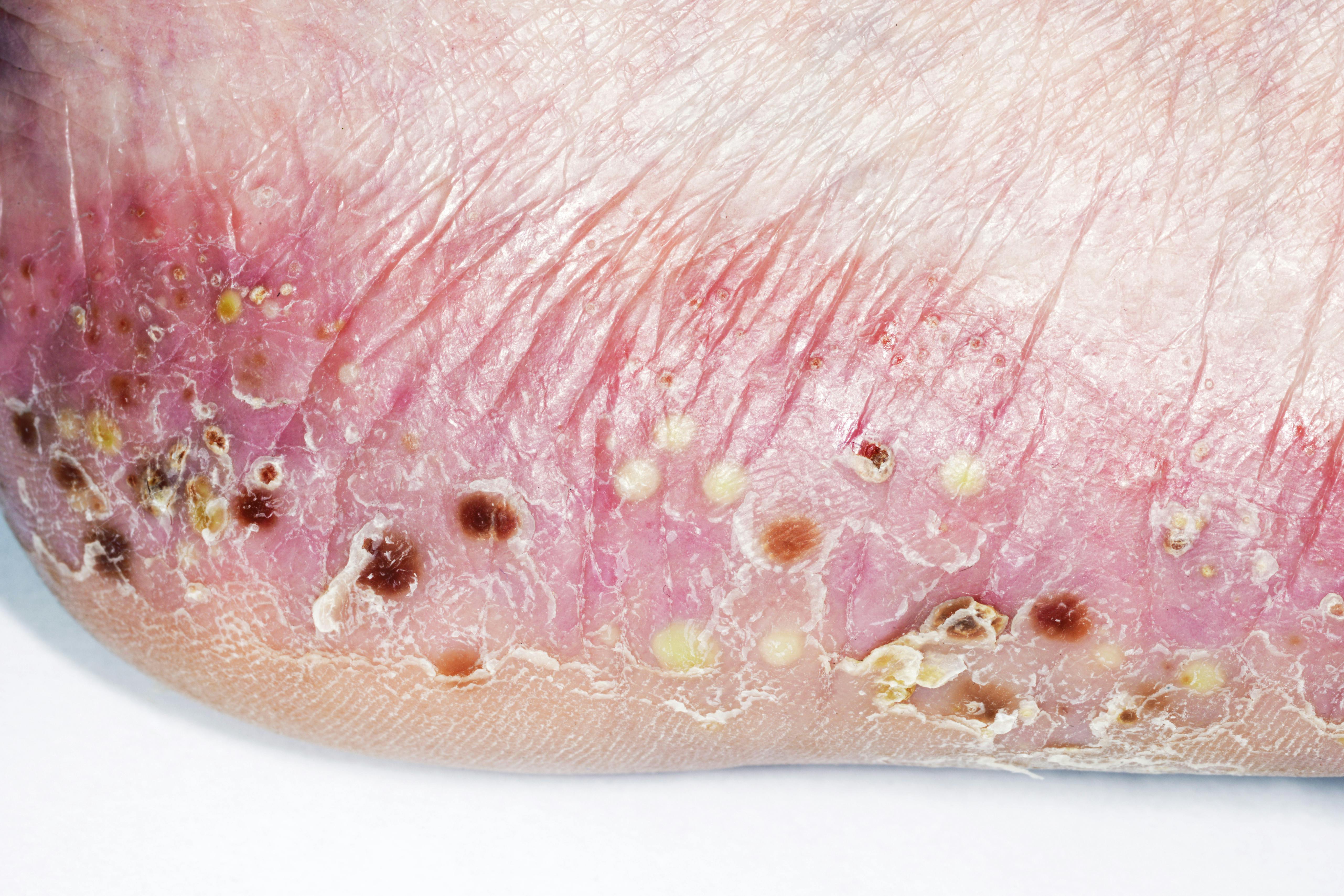 Symptom på pustulös psoriasis: Kännetecknas av områden med rodnad i huden och små vit-gula varblåsor. Innehållet i pustlerna är sterilt, det innehåller alltså inga bakterier. De kan uppstå över hela kroppen, men sjukdomen finns också i en form som framförallt uppstår i handflator och fotsulor. Om den är på hela kroppen får du ofta feber.