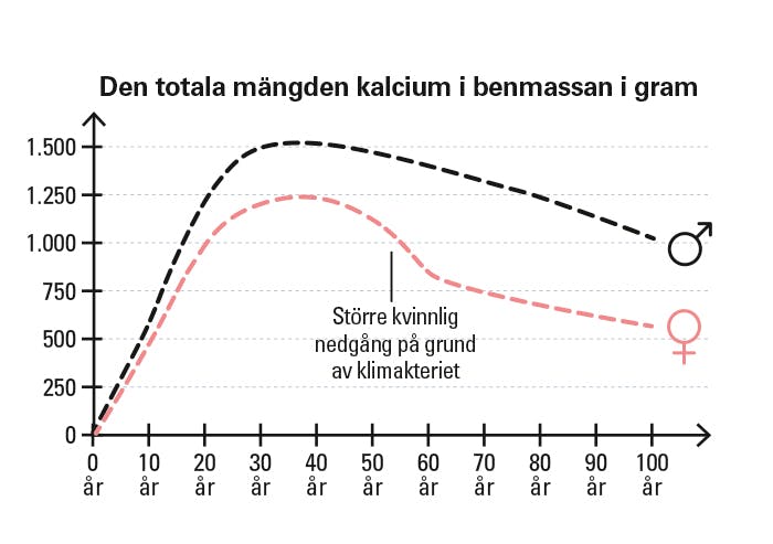 Vår benmassa är som störst vid 20–30 års ålder och förblir ganska stabil fram till cirka 45–50 års ålder. Därefter börjar kroppen bryta ner mer benvävnad än den kan bygga upp igen, så balansen blir negativ.