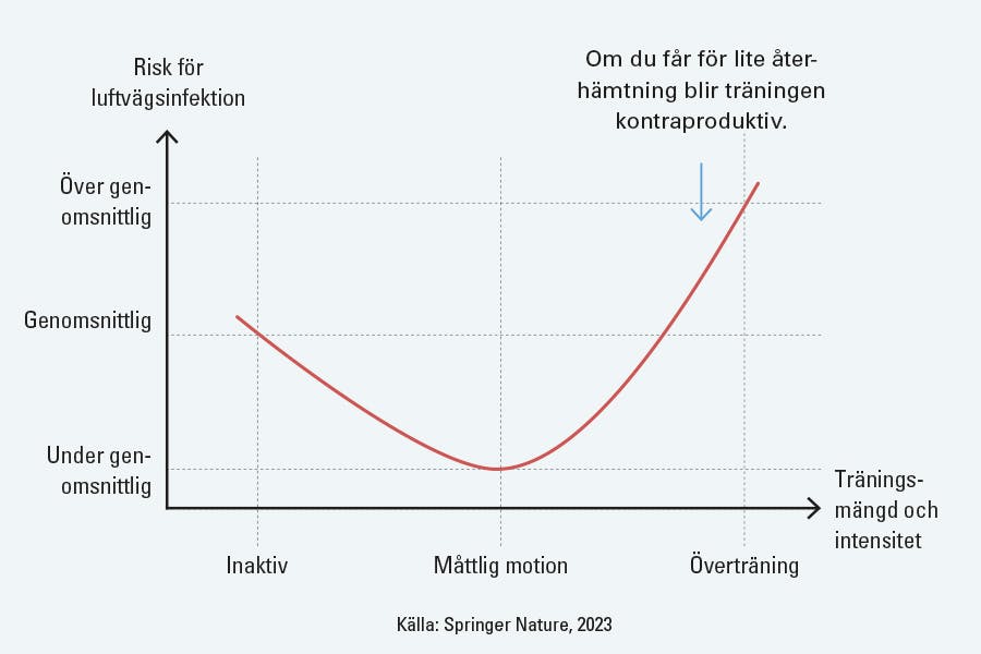 Det framgår till exempel av en ofta citerad studie från 2002. Här undersökte forskarna risken att drabbas av en infektion i de övre luftvägarna – det vill säga förkylning, halsfluss, bihåleinflammation etc – hos 547 personer och kom fram till att de som motionerade måttligt till hårt hade 20 procent lägre risk att bli sjuka under ett år jämfört med dem som inte motionerade.