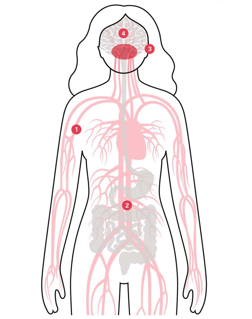 Receptorerna i de fyra områdena reagerar på olika saker. Blodbanans receptorer reagerar bl a på kemiska ämnen, medicin, alkohol och nikotin. Tarmsystemet påverkar av infektioner och virus. När vi är åk- eller sjösjuka är det receptorerna i örat som reagerar och vid migrän är det receptorerna i hjärnan.