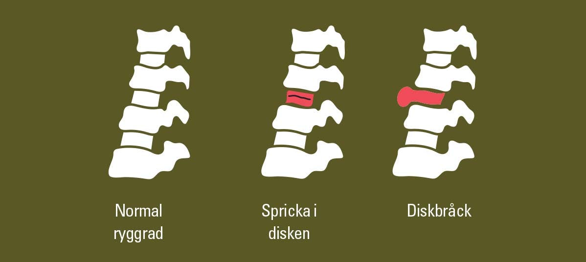Ett diskbråck uppstår när disken buktar ut mellan två kotor. Det kan göra ont och hindra dig från att röra dig. Det är vanligast att få diskbråck i nedre delen av ryggen, ländryggen. Näst vanligast är att få diskbråck i övre delen av ryggen, som kallas halsryggen. Det är mindre vanligt med diskbråck i bröstryggen.