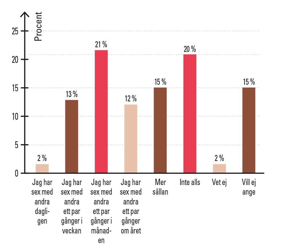 Enligt Hälsobarometern 2022, där 4.541 personer i åldrarna 18–65 år deltog, har var femte person sex med någon annan ett par gånger i månaden.