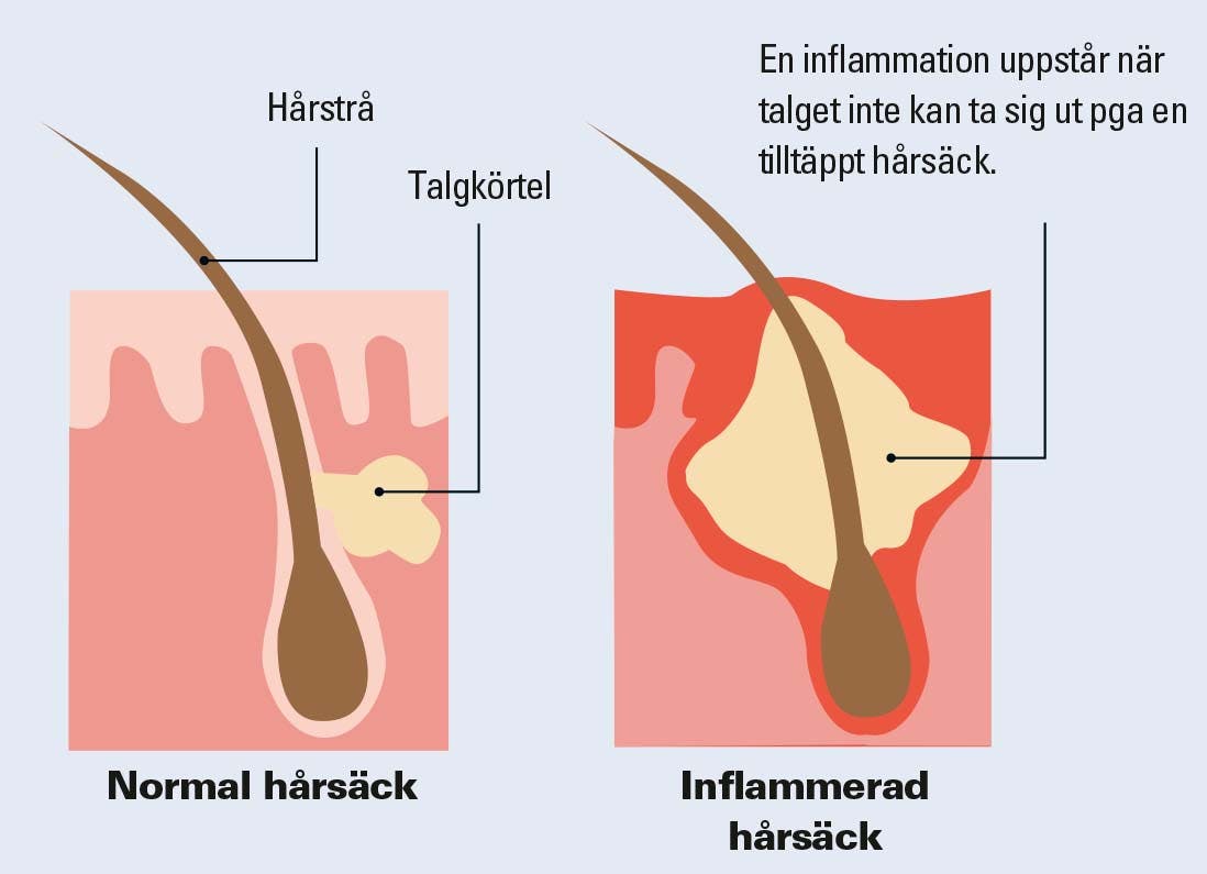 Det får talgkörteln att öka produktionen av fett. Bakterien Cutibacterium acnes ansluter sig till festen, och mynningen blockeras av döda hudceller så att talget inte kan ta sig ut. Det leder till inflammation med ömhet, rodnad och var i körtelns nedre del. En finne föds