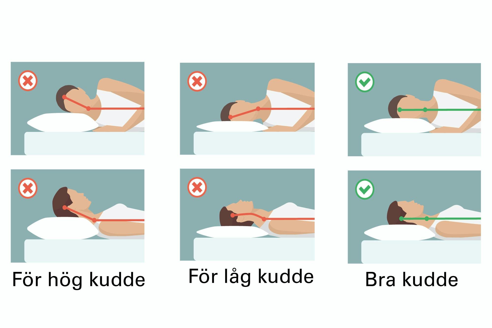 Den ska fylla hålrummet som uppstår mellan madrassen och huvudet när du ligger ner. De flesta sover på sidan, och det är den ställning där hålrummet blir störst. Det kräver en kudde i rätt höjd för att avlasta huvud, nacke och axlar.