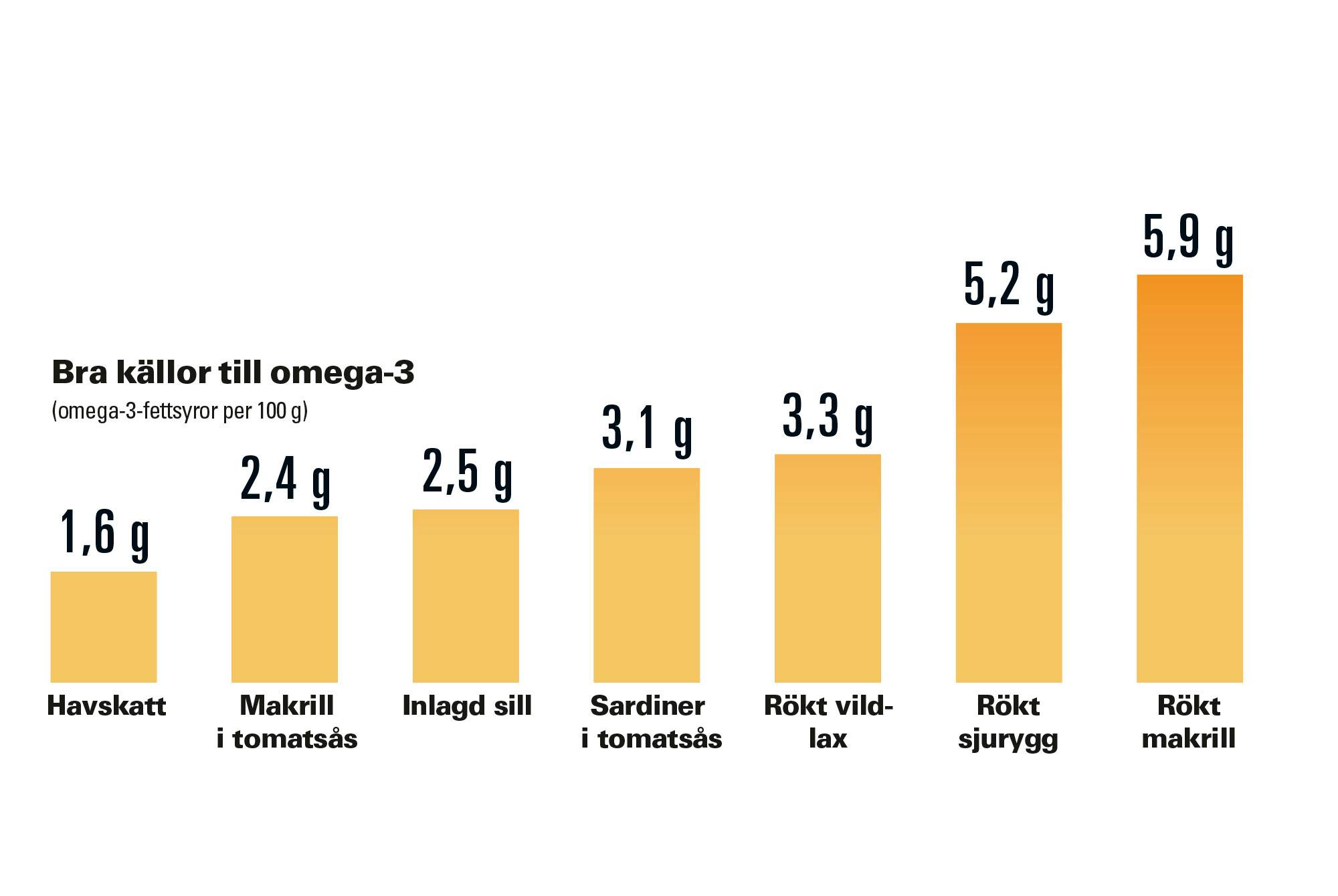 Bra källor till omega-3 (omega-3-fettsyror per 100 g)