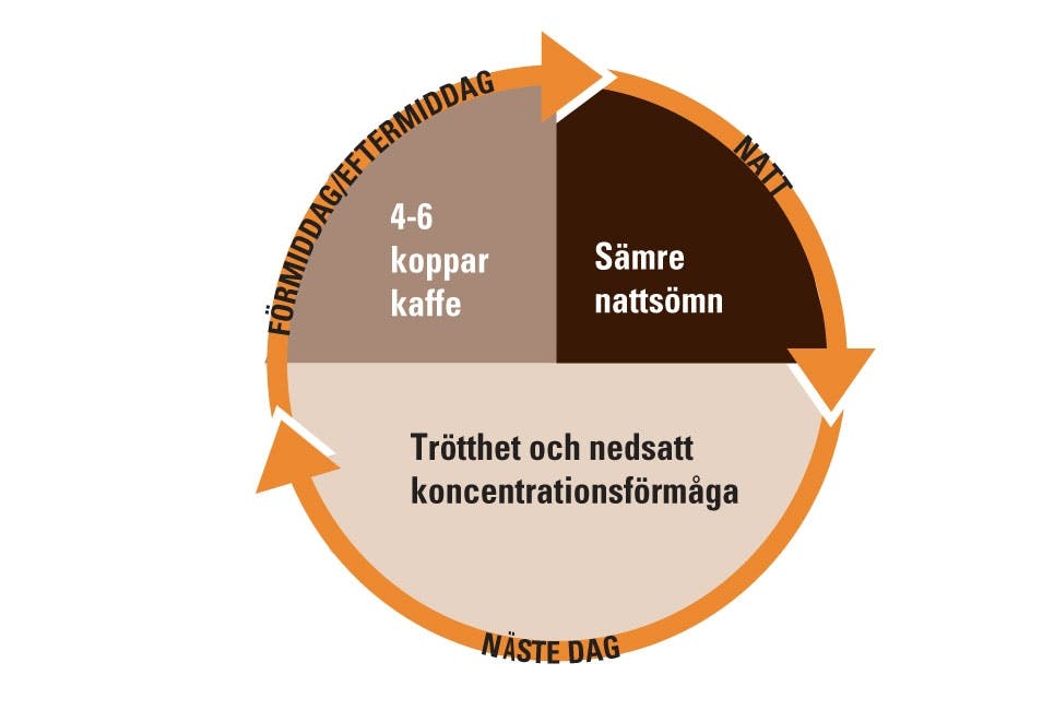 Undersökningar indikerar dock att det inte handlar om att koffeinet lyfter din koncentrationsförmåga till nya höjder, men däremot att den för upp koncentrationen till den nivå som den skulle ligga på om du var pigg och utvilad. Tillsammans med att större koffeinintag kan ha en negativ inverkan på nattsömnen och främja tröttheten under dagarna, tecknar det en bild av en negativ spiral.