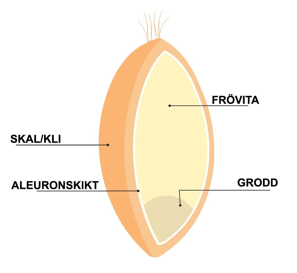 Fullkorn kan komma från t ex råg, havre, korn och vete... ja, faktiskt även vete. Det kan vara hela korn eller processade korn, t ex i form av mjöl. Det avgörande är att hela kornet har använts. Alltså att varken skaldelar eller grodd är borttagna, som de t ex är i det klassiska vetemjölet. Det är i grodden, i det tunna aleuronskiktet och inte minst i det yttersta skalet som största delen av de nyttiga ämnena gömmer sig. Det gäller både vitaminer, mineraler, proteiner, nyttiga fettämnen och framförallt kostfibrer.