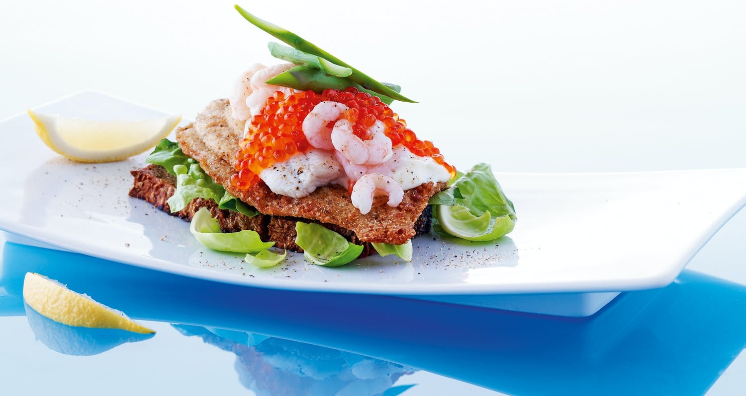 Rosta rågbrödet. Koka de gröna sparrisarna i 4 minuter. Lägg salladen på det rostade brödet, sedan de kokta och stekta fiskfiléerna, sparrisen och räkorna.
