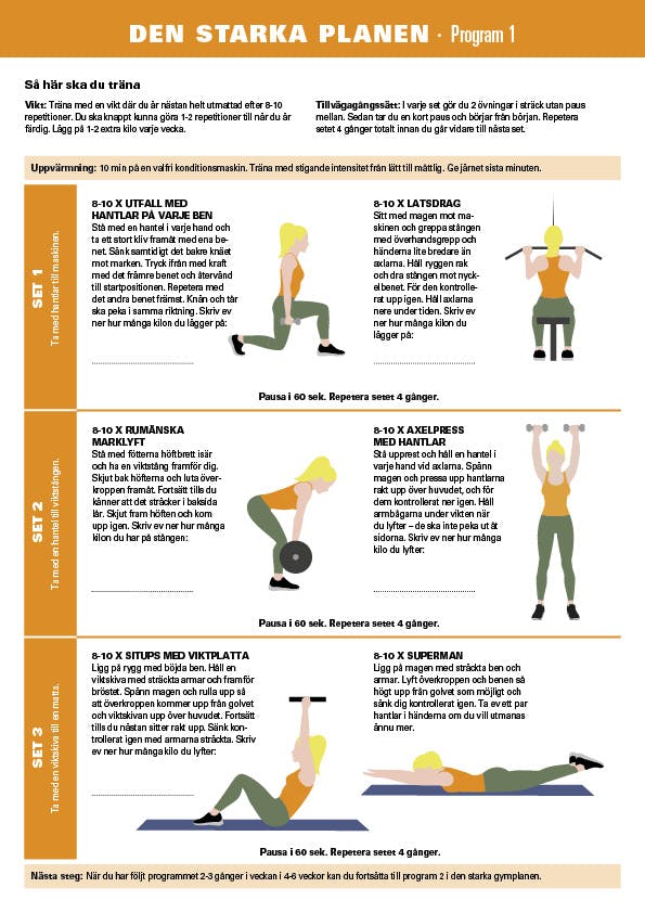 När du har följt programmet 2-3 gånger i veckan i 4-6 veckor kan du fortsätta till program 2 i den starka gymplanen.