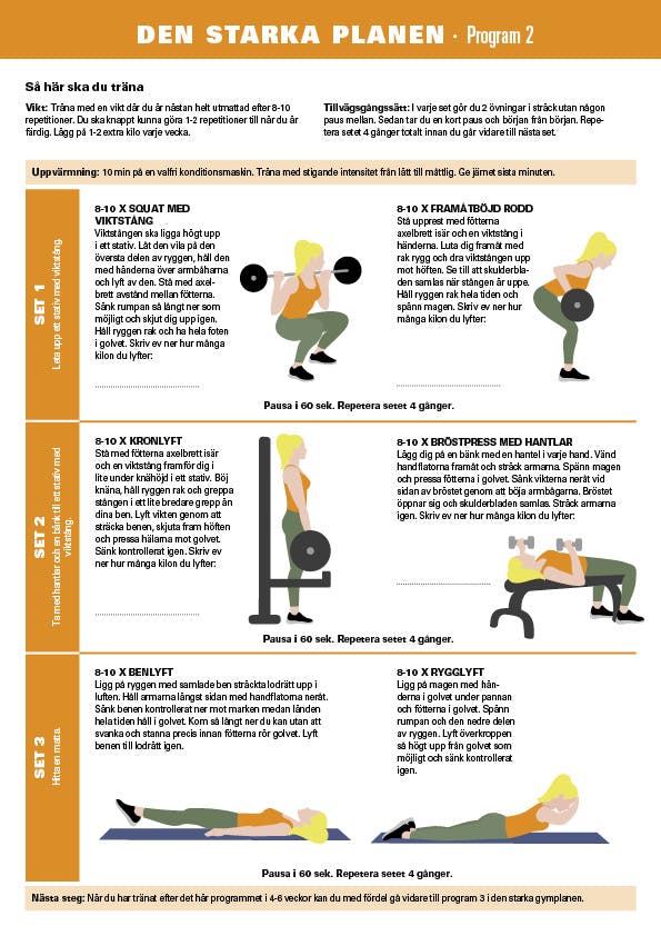När du har tränat efter det här programmet i 4-6 veckor kan du med fördel gå vidare till program 3 i den starka gymplanen.