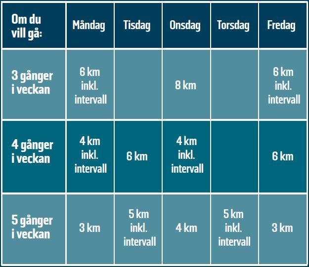 Gå minst tre gånger i veckan eftersom det annars blir för långt mellan träningspassen. Hälsobonusen är nämligen som störst de första 36–48 timmarna efter motionen. För att få upp pulsen och därmed stärka kretsloppet har programmet försetts med intervaller två gånger i veckan.