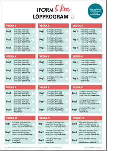 Under 12 veckor bygger du långsamt upp din kondition med 3 löprundor per vecka. Den första dagen springer du 2 x 1 minut. Den sista dagen kan du springa hela 30 minuter – eller cirka 5 km.