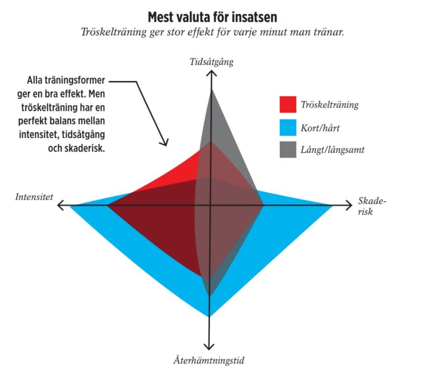 1. För det första gör tröskelträning att det är möjligt att samla på sig en högre träningsmängd med en relativt hög intensitet och därmed blir träningsutbytet bättre. Lite fyrkantigt sagt finns det två parametrar som avgör hur effektiv träningen blir: intensitet och volym. Ju hårdare och ju längre tid du tränar, desto mer kan du få ut av den. Utmaningen är naturligtvis att man också måste ta hänsyn till skaderisk och återhämtning, och därför är man tvungen att hålla igen med en av parametrarna.Kör du extremt hårda intervaller som t.ex. Vid HIIT-träning, kan du bara göra det några minuter i veckan om du ska tåla den träningen. Löper du dä remot långsamt varje gång, behöver du ge dig ut på flera riktigt långa löprundor för att få samma effekt som av den högintensiva träningen. Tröskelträning erbjuder en perfekt balans och bidrar både med en rätt hög intensitet och en rätt hög volym – därmed blir också träningsutbytet riktigt bra.