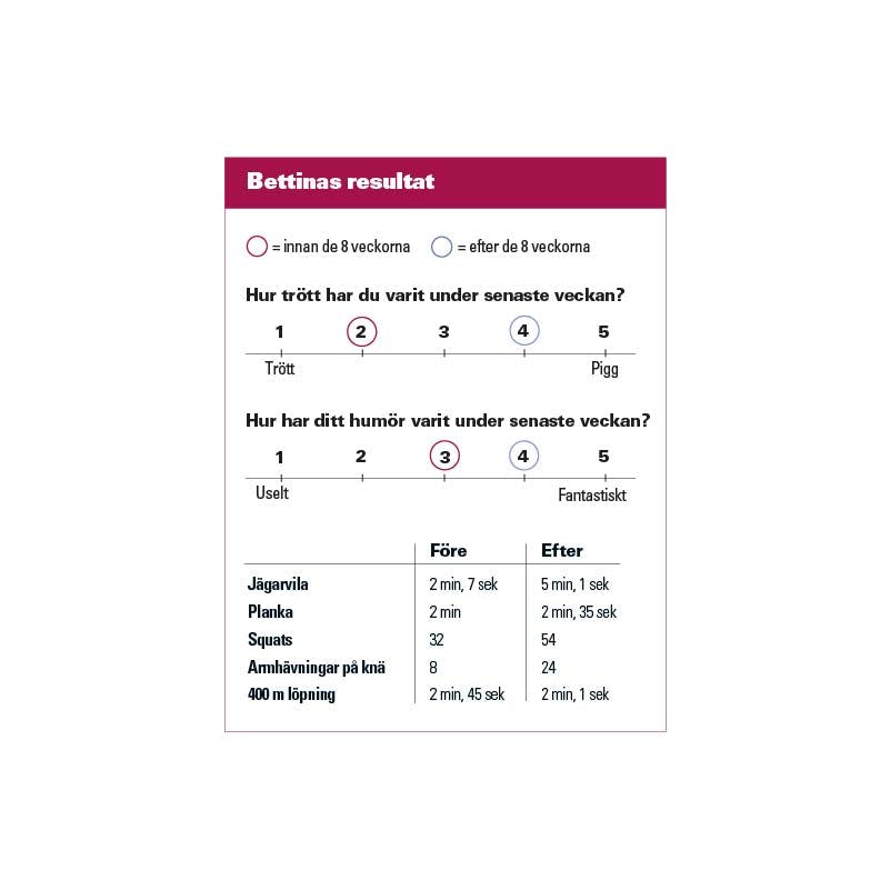 Både före och efter de 8 veckorna fyllde Bettina i ett kort frågeformulär, och den personliga tränaren Christina Heick testa- de hennes styrka och kondition. Se här hur det gick: