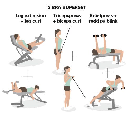 Vanligtvis väljer du två övningar som tränar olika muskelgrupper – t ex en ryggövning och en bröstövning. På så sätt får den ena muskelgruppen vila medan du tränar den andra.