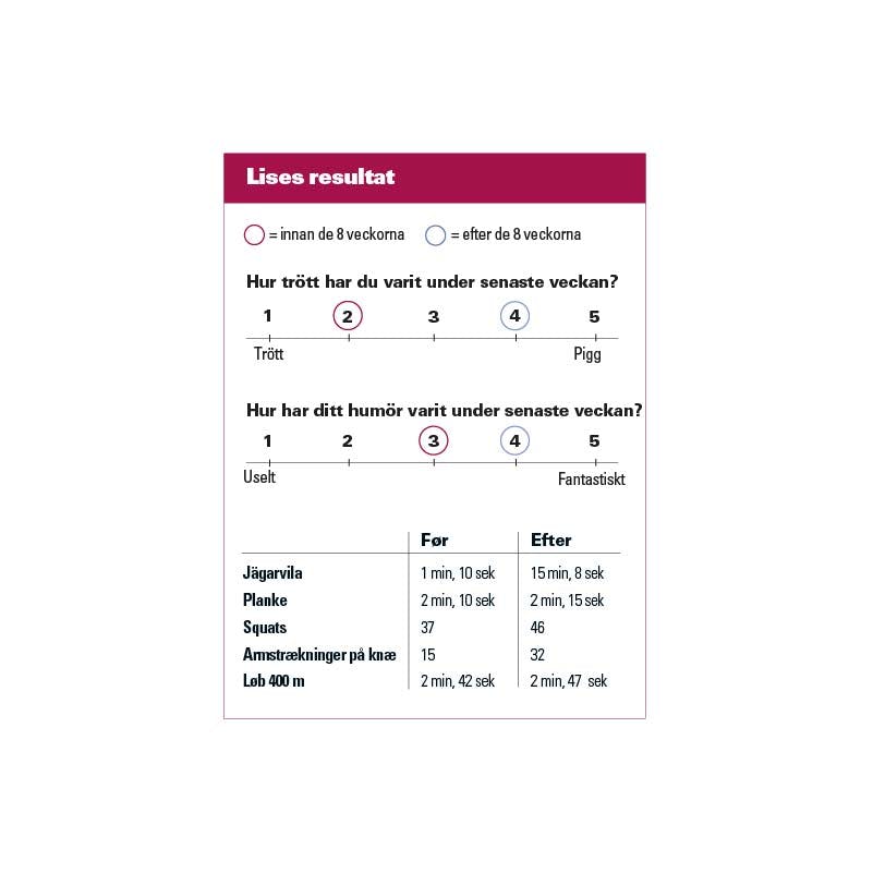 Både före och efter de 8 veckorna fyllde Lise i ett kort frågeformulär, och den personliga tränaren Christina Heick testade hennes styrka och kondition. Se här hur det gick: