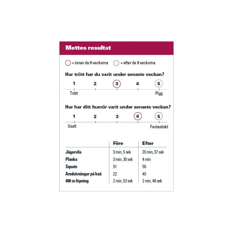 Både före och efter de 8 veckorna fyllde Mette i ett kort frågeformulär, och den personliga tränaren Christina Heick testade hennes styrka och kondition. Se här hur det gick: