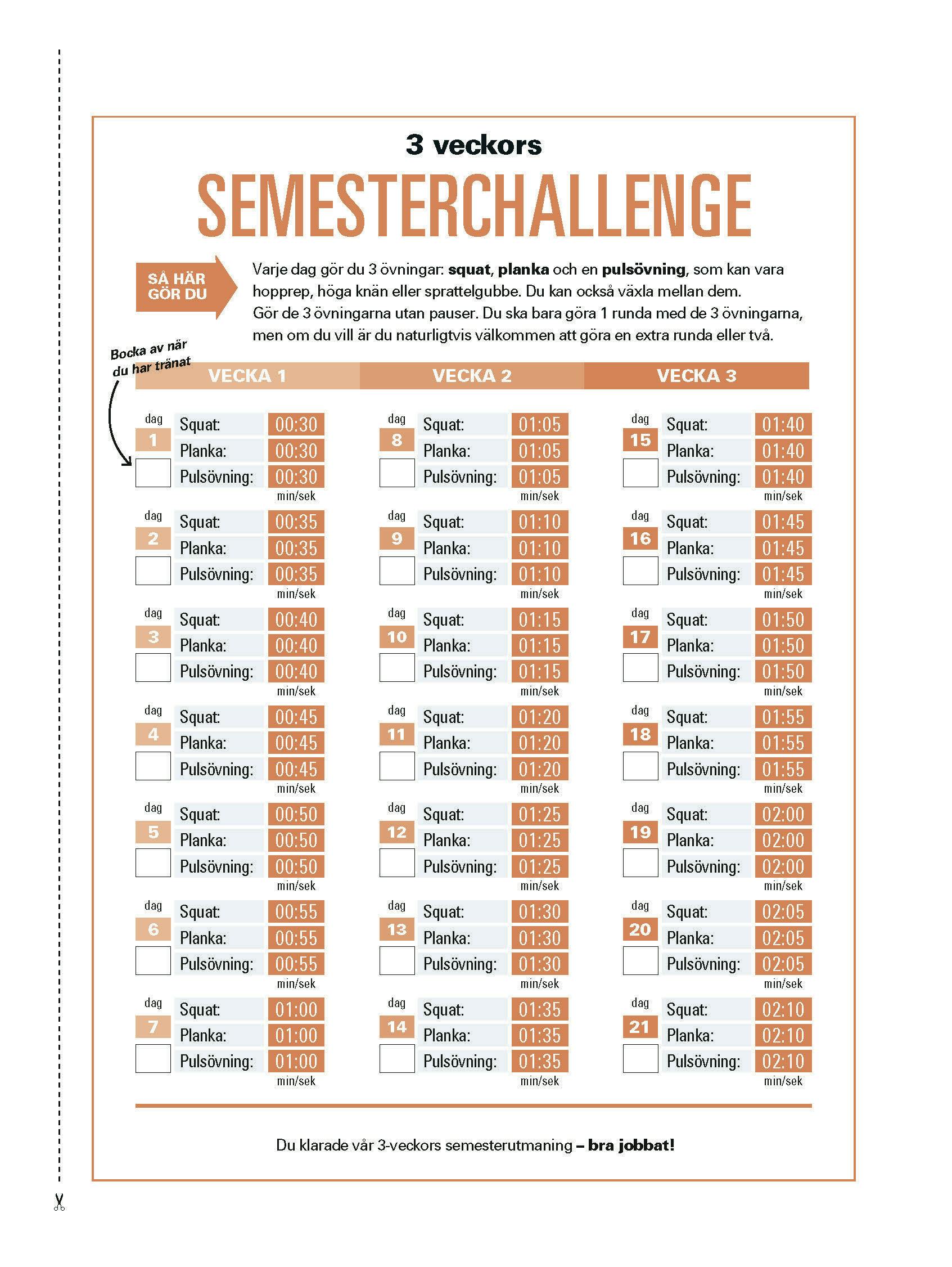 Den första dagen ska du göra varje övning i ynka 30 sek, och det kan de flesta säkert klämma in – även på semestern. För varje dag lägger vi till 5 sekunder. På utmaningens sista dag kommer du alltså att göra varje övning i 2 min och 10 sek. Det är bra för motivationen att tävla med sig själv, och då är du så stark att du kommer att klara det utmärkt!