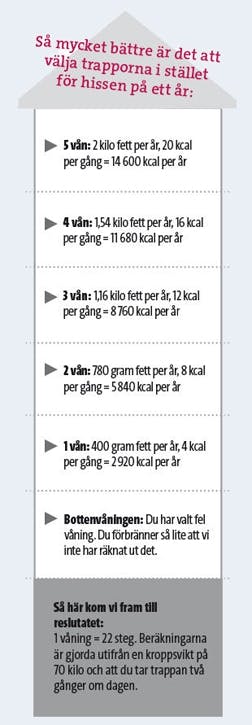 Träning Så mycket ... Så mycket förbränner du i trapporna Trappträning ger dig en enorm träningsbonus i vardagen steg för steg - här kan du se hur mycket det blir på sikt. Av I FORM-redaktionen 23 november 2010 Nå toppformen genom att ta trapporna. Lägg till i favoriter Ta bort från favoriter Trappträning
