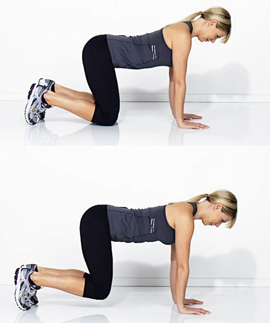 Ställ dig på alla fyra med knän och handflator i golvet. Spänn magen och axlarna och lyft knäna ca 5 cm från golvet. Håll kvar så länge du kan. Upprepa övningen 5–10 gånger.