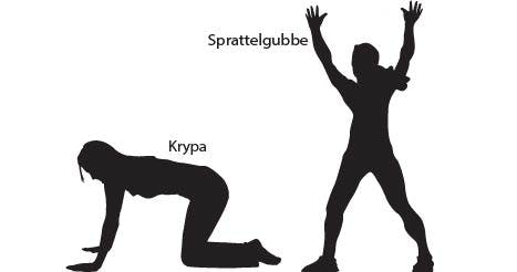 Krypa och gå krabbgång: Kryp ca 10 meter på knä och händer. Skaka armarna i ett par sekunder. Gå tillbaka till krypposition, men lyft nu upp knäna från golvet så de hänger i luften. Kryp 10 meter igen. Vila kort. Kryp som en krabba – först framåt, sedan baklänges och till sist i sidled.